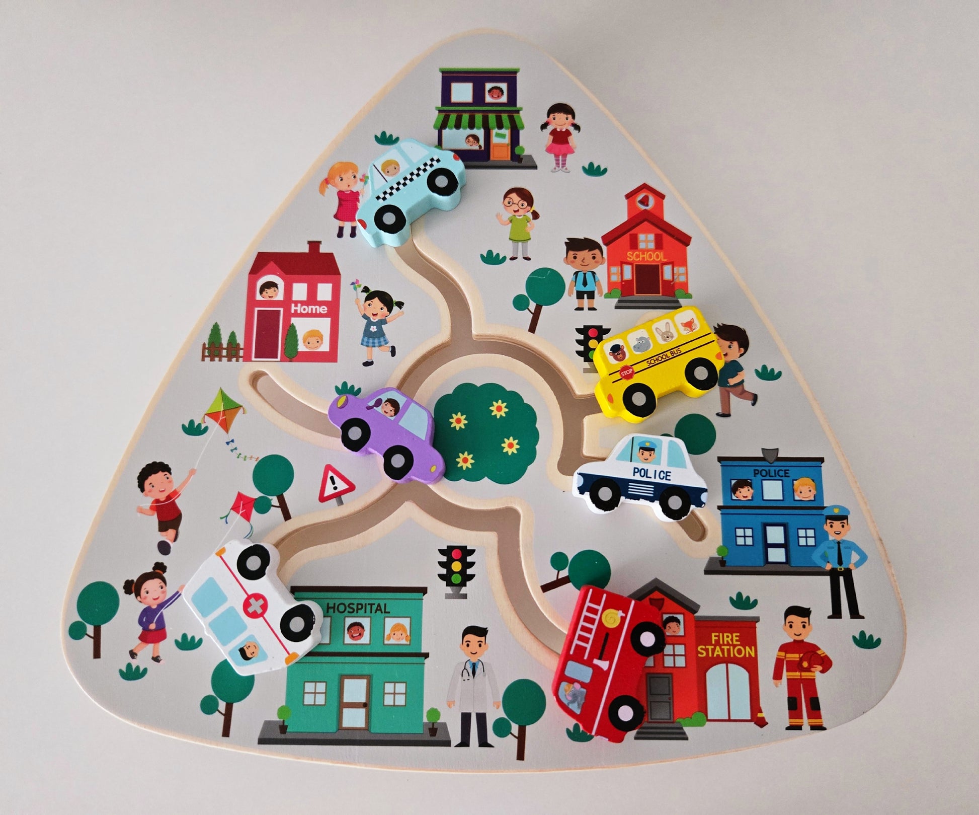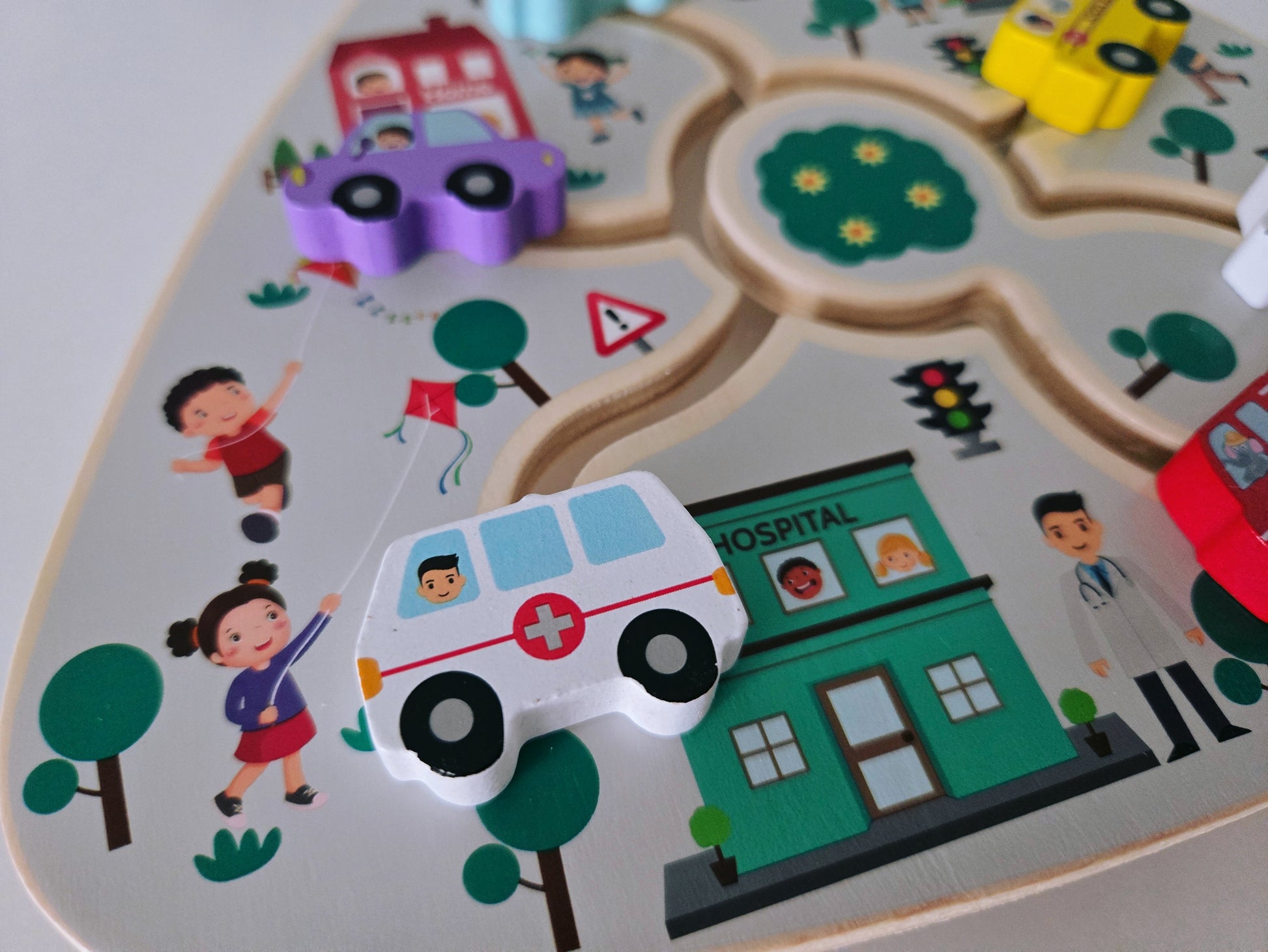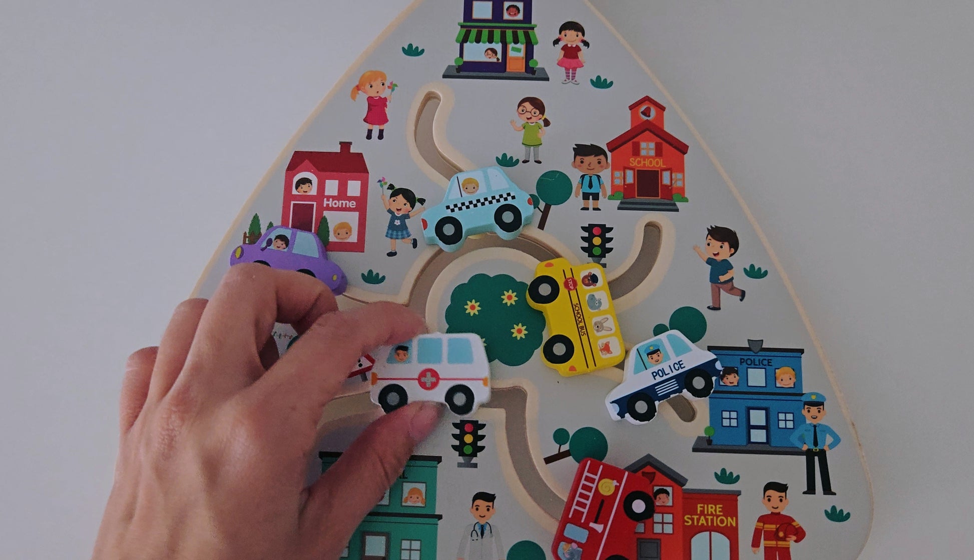 Дървена дъска с подвижни превозни средства – забавна и образователна играчка, която развива въображението, фината моторика и концентрацията на детето.